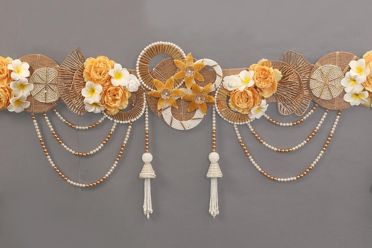 A luxurious handcrafted toran featuring golden flowers, elegant beadwork, and cascading tassels—perfect for elevating doorways, pooja spaces, and festive décor.