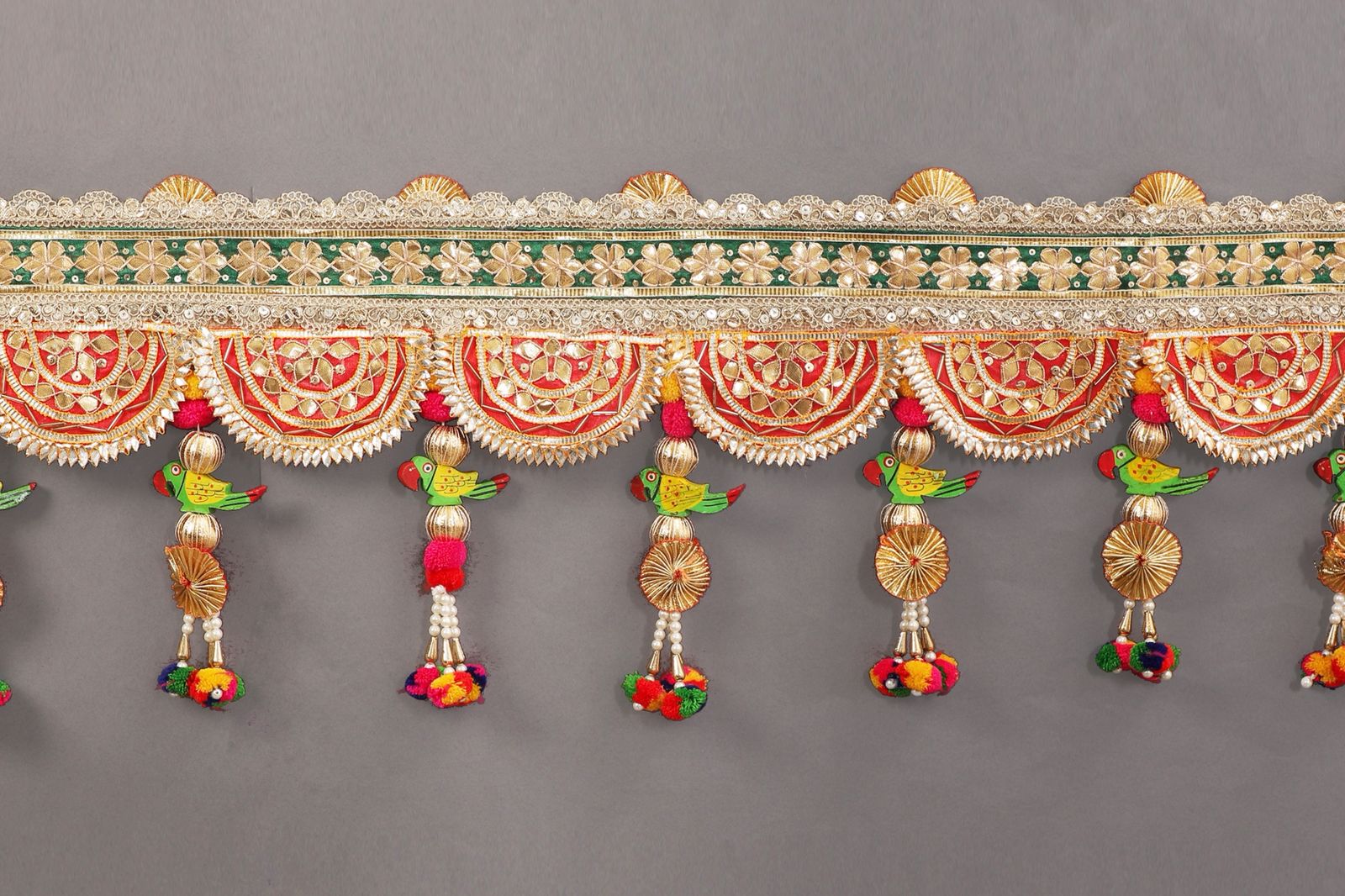 A traditional handcrafted toran featuring intricate zari work, vibrant red and gold motifs, and charming parrot embellishments—perfect for adorning doorways and creating a warm festive vibe.