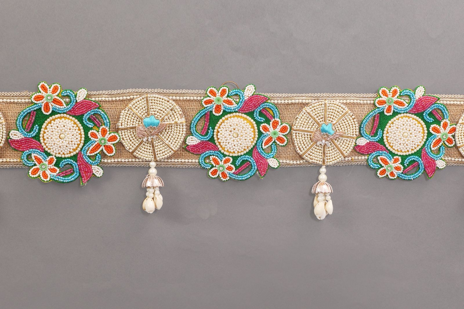 A colorful handcrafted toran adorned with intricate beadwork, bright floral motifs, and shell tassels—perfect for creating a festive and welcoming doorway décor